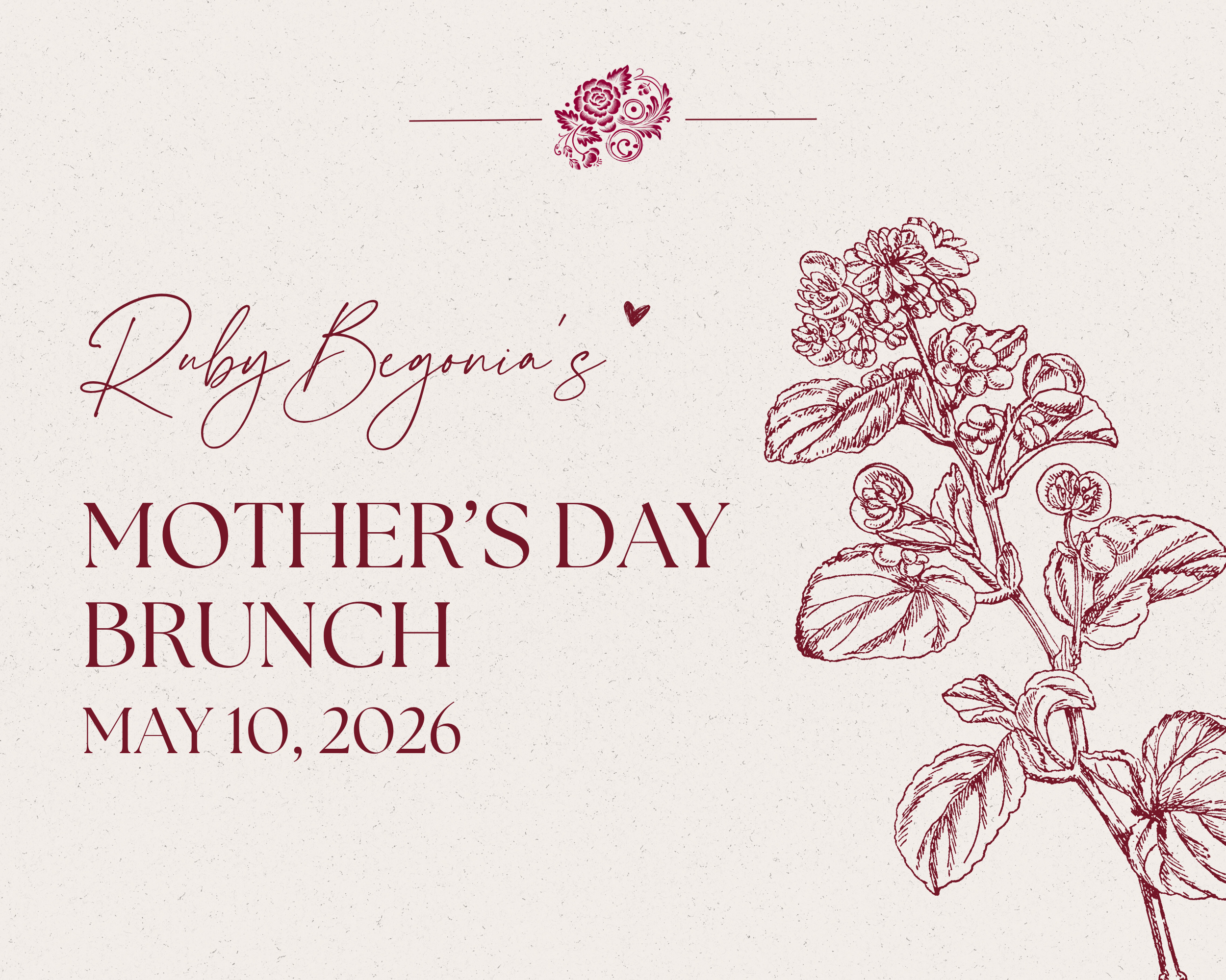 This Mother’s Day, gather around the table at Ruby Begonias. Treat Mom to a relaxed, delicious brunch filled with thoughtful dishes and the kind of moments she’ll remember long after the last bite.